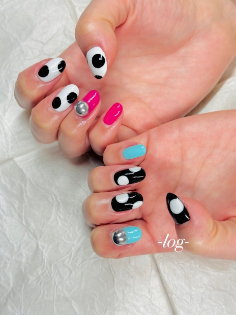 左右で色を変えた大き目ドットのカジュアルネイル〇